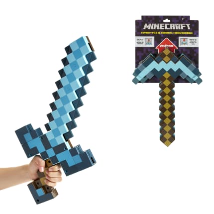 Kids can battle and play out Minecraft adventures in the real world with this life-size 2-in-1 role-play toy! Mine with the Diamond Pickaxe, then with one smooth motion prepare for attack with the Diamond Sword! Featuring Minecraft's iconic pixelated design, the tool fits a kid's hand just right and looks like the in-game counterparts. Arm imaginations or accessorize a costume to battle hostile mobs and mine ore, just like in the video game! Colors and decorations may vary.