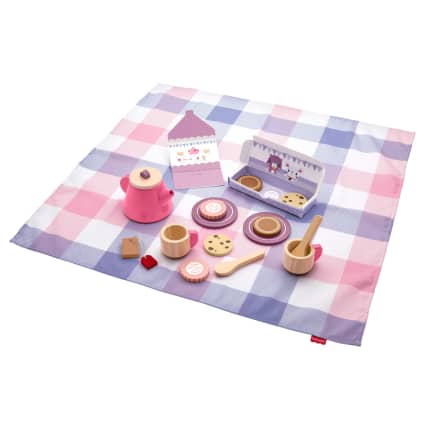 Élégant service à thé miniature avec pièces en bois et couverture de pique-nique en tissu doux