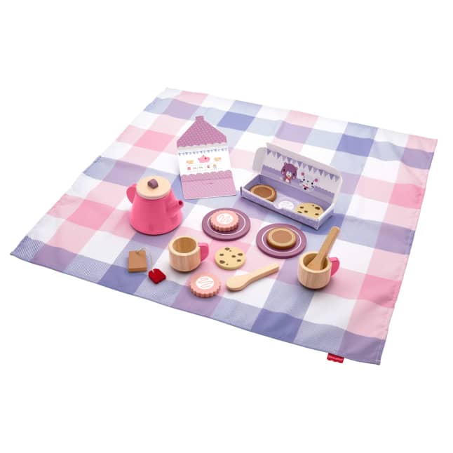 C’est l’heure du thé! Les enfants d’âge préscolaire peuvent organiser et partager une collation à deux grâce à ce service à thé en bois de Fisher-Price. Ce coffret de 18 pièces comprend une couverture en tissu doux, une invitation en papier, des tasses, des soucoupes, des cuillères en bois, une théière avec couvercle, un sachet de thé et une boîte de biscuits contenant 6 gâteries factices à partager. Fabriqué à partir de bois certifié par le Forest Stewardship Council (FSC-N004566) et décoré avec des peintures à base d’eau non toxiques, ce service à thé encourage les jeux de rôle, l’expression orale et les capacités relationnelles. Ne pas utiliser avec de vrais aliments. Les couleurs et les motifs peuvent varier.