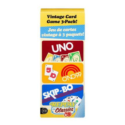 Card game lovers can enjoy three classics bundled together in one with this vintage-inspired set of UNO, O'NO 99 and Skip-Bo. UNO offers timeless fun as players match colors, numbers and symbols. O'NO 99 brings strategic excitement as players try to avoid playing the card that pushes the total to 99 or higher. Skip-Bo challenges players to be the first to clear their cards in sequence. Each game features retro-style graphics, adding a nostalgic charm to game nights with friends and family. Three great games, one cool-looking pack perfect for creating fun-filled evenings with players ages 7 years old and up! Colors and decorations may vary.